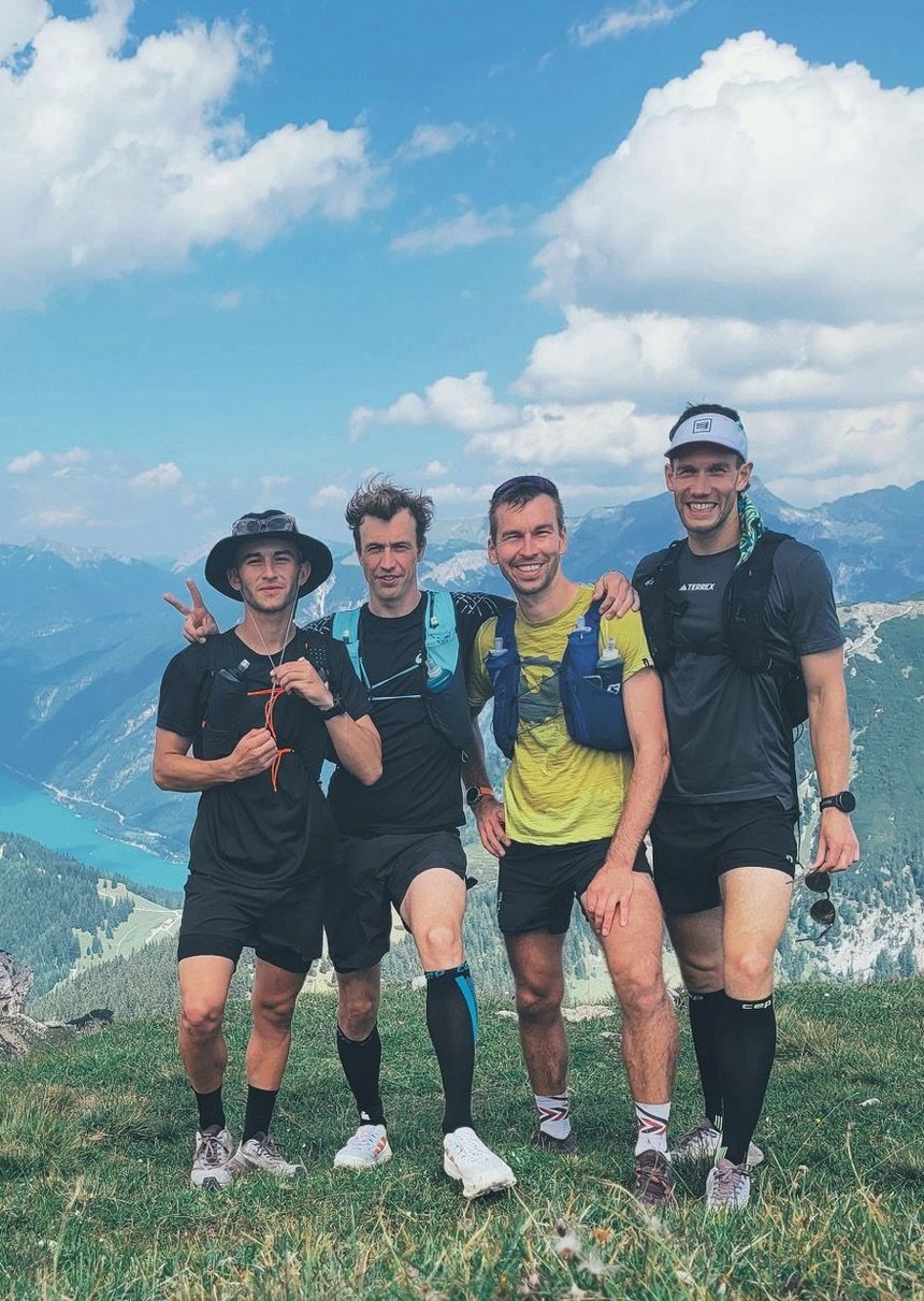 Der dritte Tag forderte das Quartett am stärksten: Acht Gipfel, 3.000 Höhenmeter und anspruchsvolles hochalpines Gelände. Nach sieben Stunden Bewegung brachte ein aggressiver Bulle auf einer Weide die Läufer aus dem Rhythmus – eine Stunde Umweg über schwieriges Gratgelände kostete Kraft, sorgte aber auch für einen Adrenalinschub. Der Blick über die endlosen Täler entschädigte für die Anstrengung.