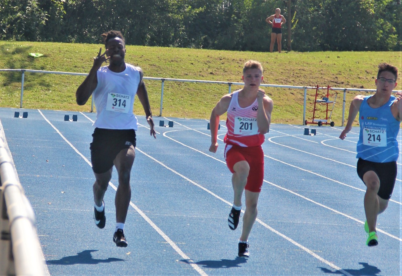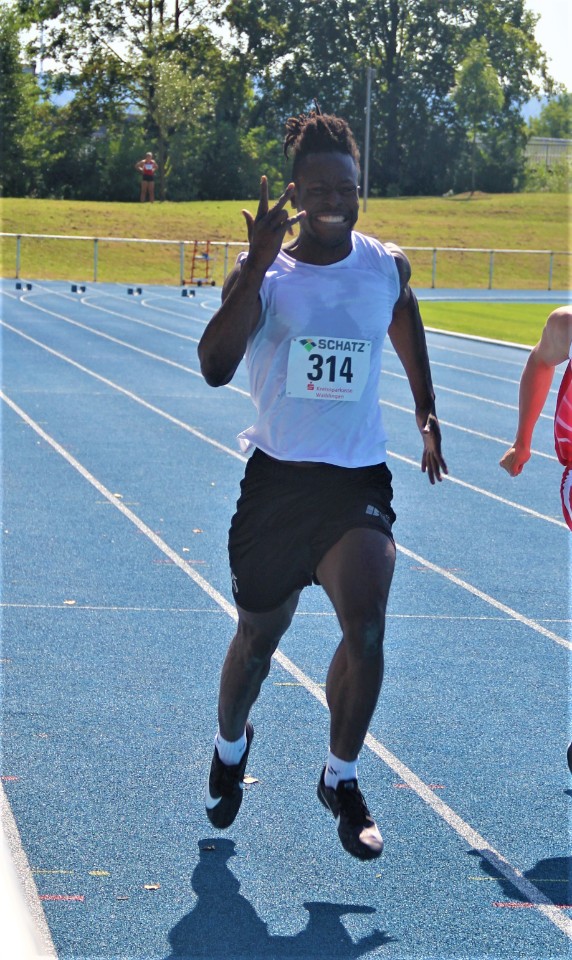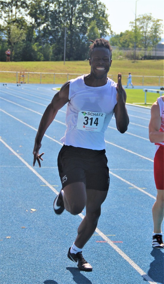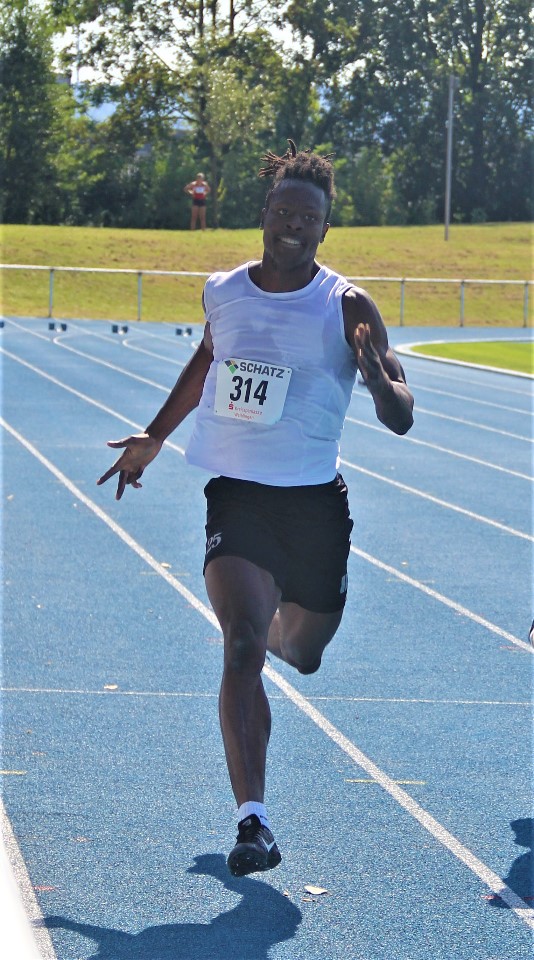 Footballer Junior Nkembi hat nach Absage der gesamten Saison den Focus auf den leichtathletischen Sprint gelegt und bereichert die Trainingsgruppe der TSG Schwäbisch Hall ungemein. Mit bekanntem fulminantem Antritt ist er immer gefühlter Beschleunigungssieger, muss aber im weiteren Rennen erkennen, dass auch 100m lang werden können. 11,35 Sekunden brauchte der sympathische 24 Jährige und ist damit minimal schneller als Julian Haag vor wenigen Tagen. Dieser wollte bei optimalem Sprintwetter eine weitere Schüppe drauflegen und Bestzeit rennen. Leider bekam der Jugendlich die volle Härte der Fehlstartregel zu spüren: ein Zucken zu früh und mit nachfolgender Disqualifikation war eine gute Chance die DM Qualifikationsnorm zu erfüllen verstrichen. Über 200m lief es dann besser und Julian bestätigte die tolle Leistung aus Besigheim in der Vorwoche. 22.96 Sekunden waren aber keine Verbesserung, immerhin aber doch der Sieg in der U20 und ein versöhnliches Ende.