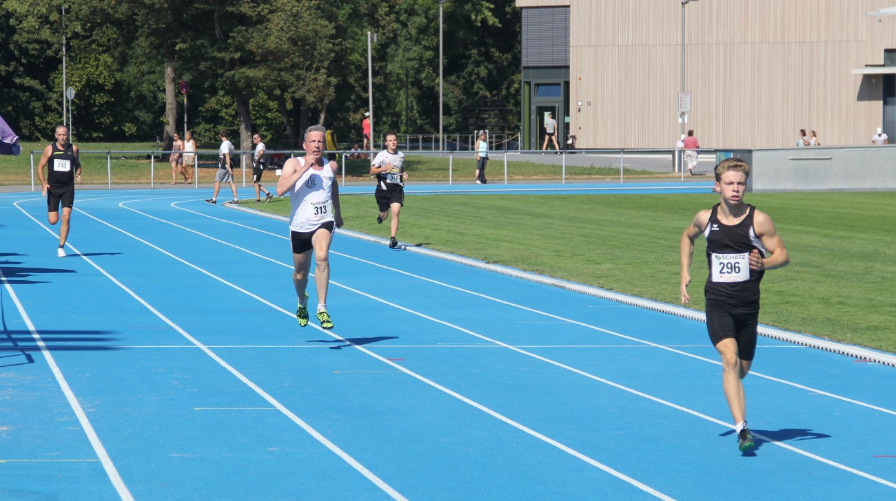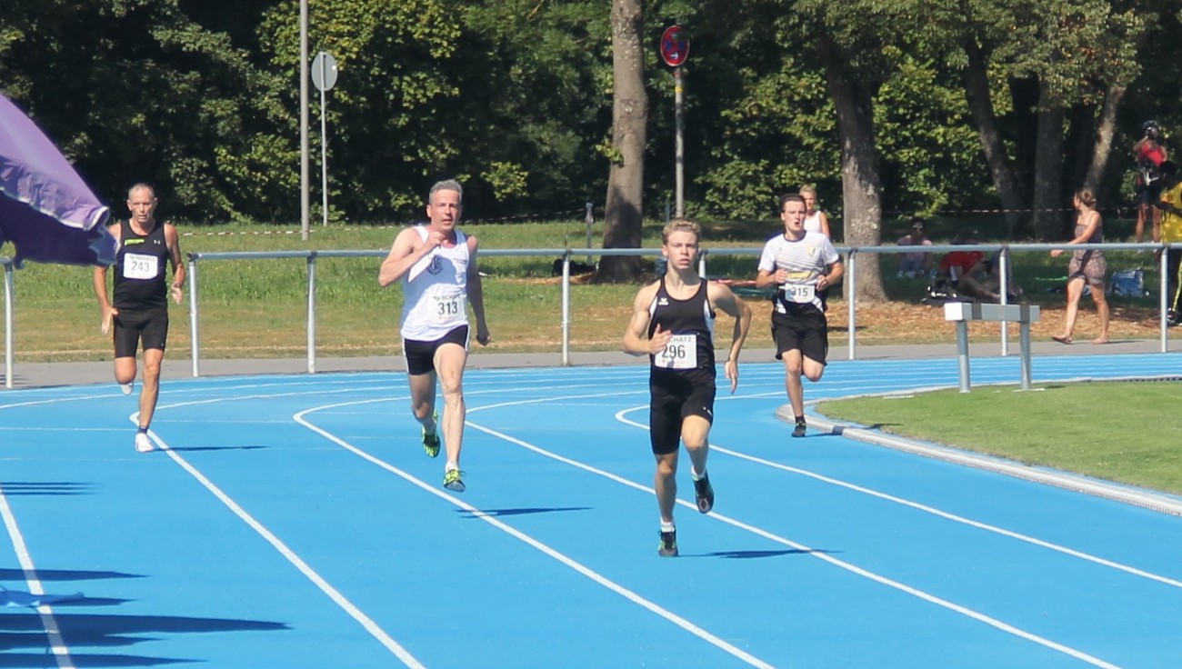 Christian Döring und Christoph Müller wollten es über die Stadionrunde wissen: beide werden nur sehr wenige Starts in 2020 bestreiten können, deswegen gab Döring die Losung „all in“ aus. Schnell angehen, alles auf eine Karte setzen und hoffen, dass es am Ende gut geht. Soll heißen, dass kein verheerender Einbruch auf der Zielgeraden zu erleiden ist. Döring in diesem Jahr aus verschiedenen Gründen nicht ganz so spritzig-sprintschnell, startete couragiert ganz nach seinem Motto. Trotzdem hatte er vermutlich einige Zehntelsekunden liegen lassen müssen, um nach einem sehr beachtlichen Finish nur knapp über der angestrebten „50 er“ Zeit ins Ziel zu kommen. Zweiter Platz in 51.37 Sekunden und somit ca. eine Sekunde flotter als beim TSG Testwettkampf im Schenkenseestadion vor ca. 4 Wochen. Senior Müller, der Hitzerennen zwar nicht liebt, aber dennoch kann, hatte ein glückliches Händchen bei der Renneinteilung. Auch er konnte ordentlich durchziehen und in beachtlichen 58,93 Sekunden den einen oder anderen Jugendlichen hinter sich lassen. Die 4 TSG Athleten haben mit zusammen Stefan Döring eine effektive Trainingsgruppe gebildet, in die jeder seine Talente und Fähigkeiten produktiv einbringt: Trainer Quenzer freut es.